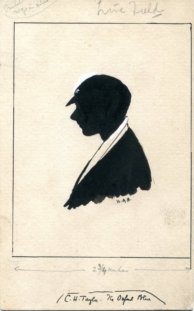 Black, Head and shoulders, profile, silhouette picture. Outlined. Young man, facing left, wearing cap with white motif and white shirt. Signed ‘W.A.B.’. 'C.H. Taylor The Oxford Blue' along lower edge. Measurements and notes written in pencil and pencil copy of head on reverse.