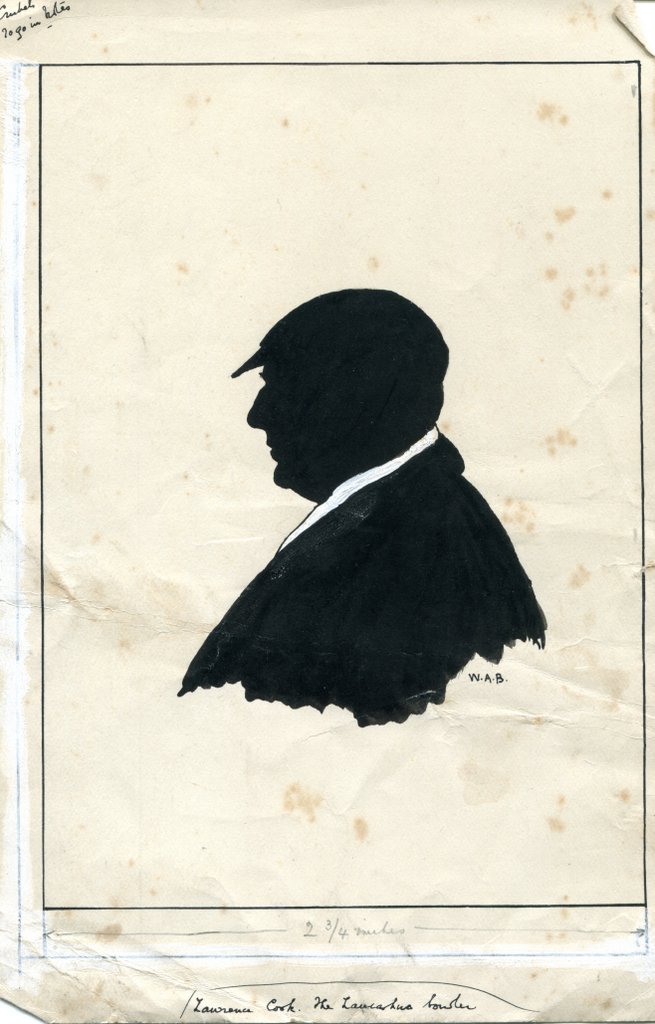 Black, Head and shoulders, profile, silhouette picture. Outlined. Man with double chin, facing left, wearing cap and white scarf. Signed ‘W.A.B.’. ''Lawrence Cook, the Lancashire Bowler' written along lower edge. Measurements and notes written in pencil and ink