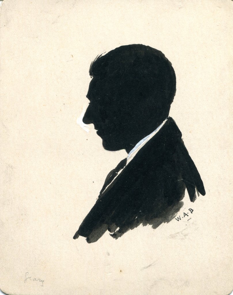 - BeschrijvingBlack, Head and shoulders, profile, silhouette picture. Man facing left, wearing jacket ith white shirt and black tie. Signed ‘W.A.B.’. 'Geary' written in pencil on lower edge