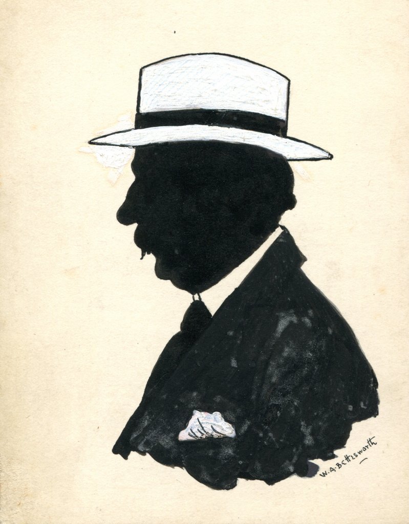 - DescriptionBlack, Head and shoulders, profile, silhouette picture. Man facing left, wearing white hat and jacket with white handkerchief in pocket. Signed ‘W.A.Bettesworth.’.