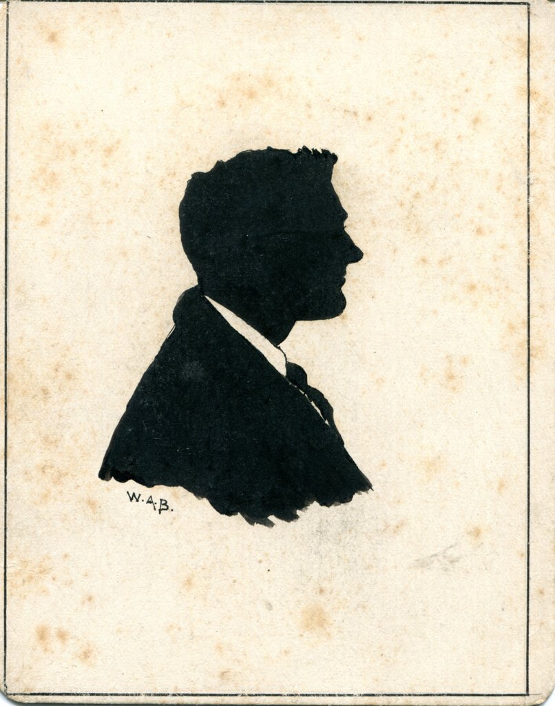 - DescriptionBlack, Head and shoulders, profile, silhouette picture. Outlined. Man with quiffed fringe, facing right, wearing black tie. Signed ‘W.A.B.’. 'F Bale, The Leicestershire Slow Left Hander' written on reverse