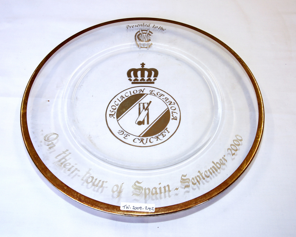 - DescriptionLarge, round glass plate with gold rim. Gold lettering ‘Presented to MCC on their tour of Spain September 2000’ Crest in centre, crown above stumps, ball and bat ‘Asociacion Espanola de Cricket’