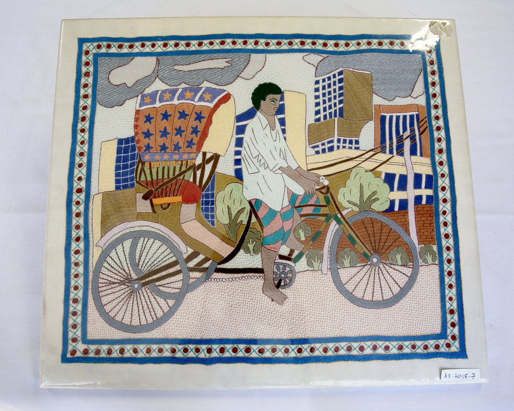 Embroidery of a man on a rickshaw. Buildings in background. Attached to stretcher